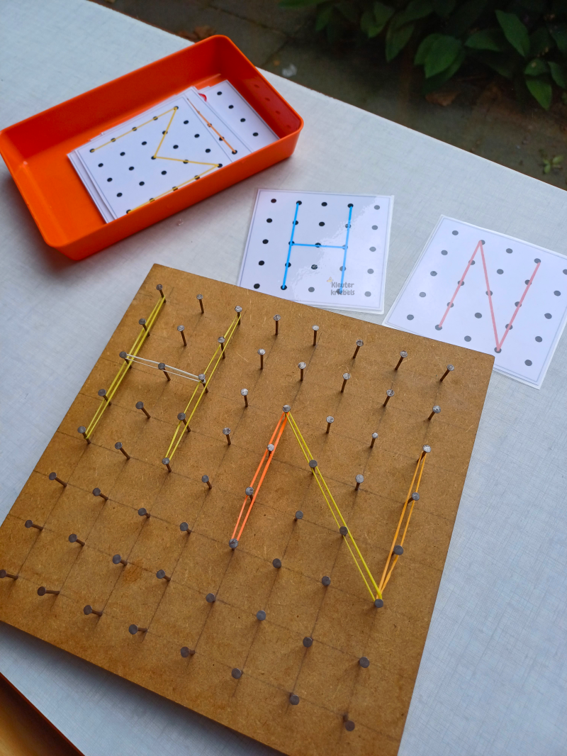 - Ook voor de letters hadden we een hoekje met focusdoel motoriek: het rekkeplankje. We voorzien opdrachtkaarten van de letters en de kleuters maken deze met elastiekjes op de plank. Heel eenvoudig, maar dit vonden ze echt heel leuk!
