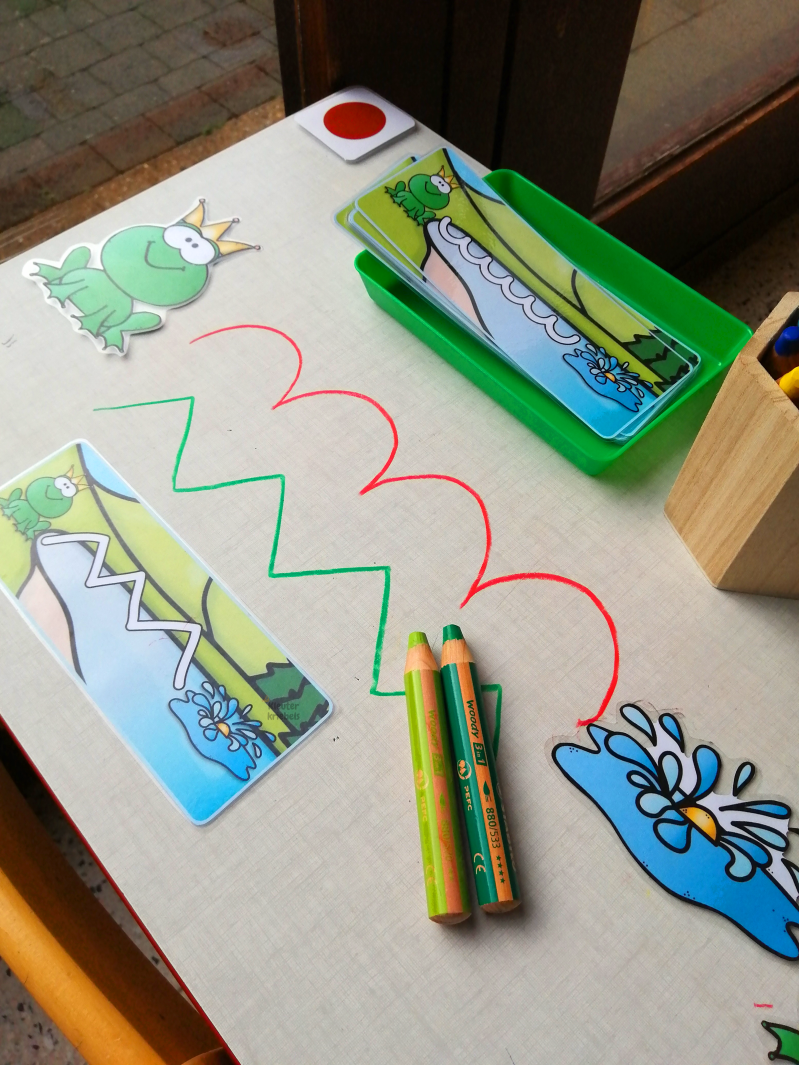 - Zoals elk thema proberen we te werken aan vormgeving. De kleuters gaan dus in kleine groep aan de slag met een stappenplan van de kikkerprins. Daarbij maken ze ook een achtergrondje: met wasco's tekenen ze schrijfpatronen en daarna gaan we erover met ecoline. De kroon van de kikkerprins schilderen we ook goud.