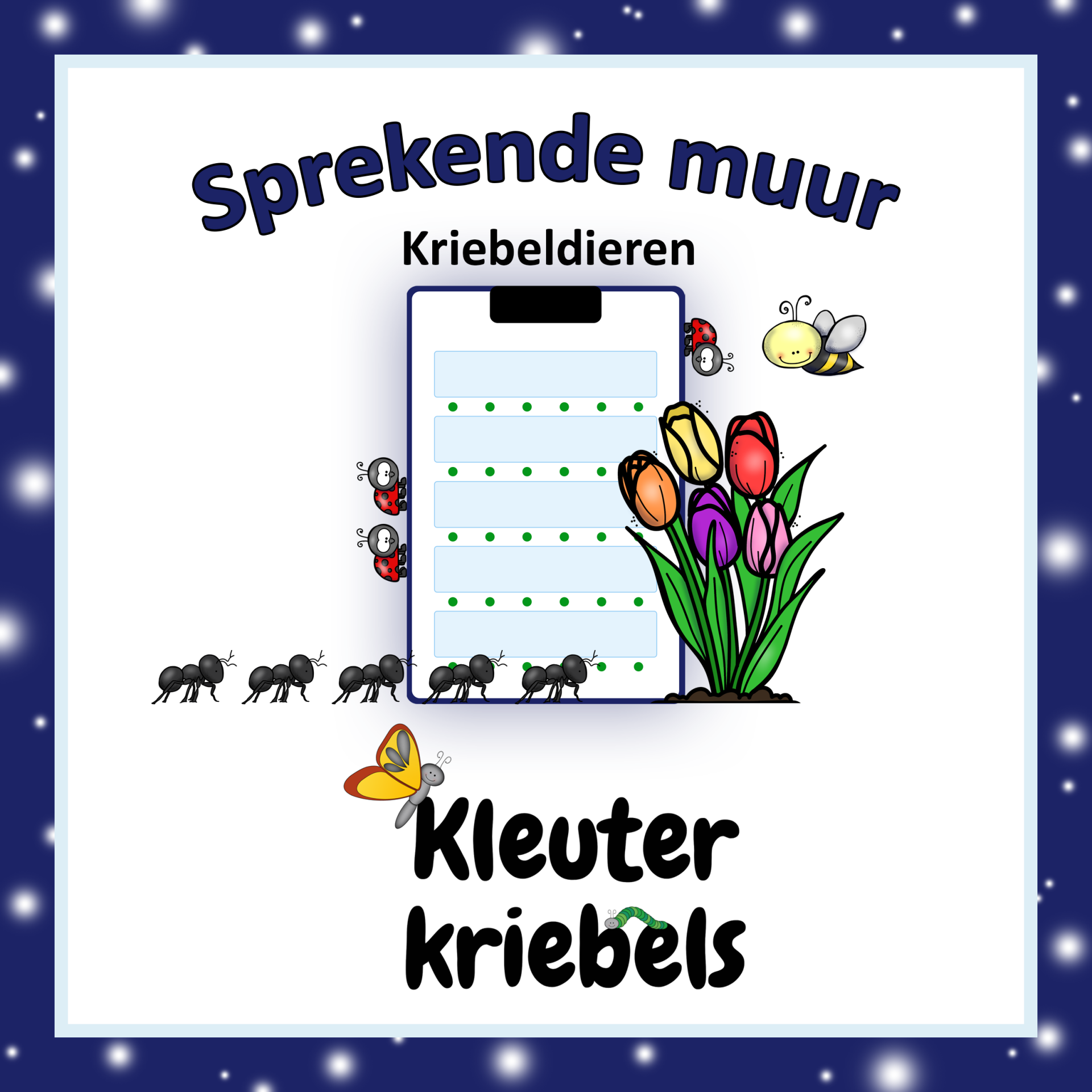 - 16 woordkaartjes: 8 kriebeldieren en 8 soorten bloemen.