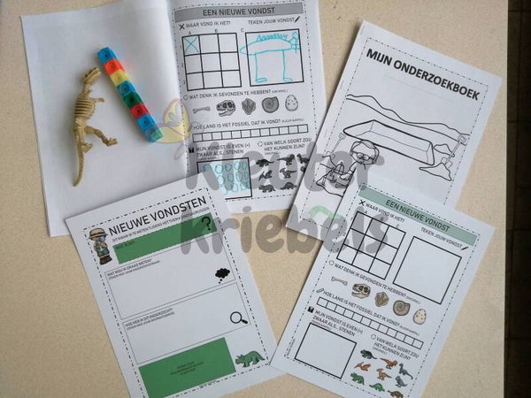 - Onderzoekboek + weetjesblad voor paleontologenhoek en daarbij prenten voor spelplanning.
